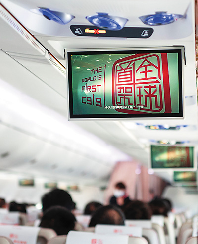 The 12-inch hanging display in C919 cabin supports high-definition 1080P movie screening.