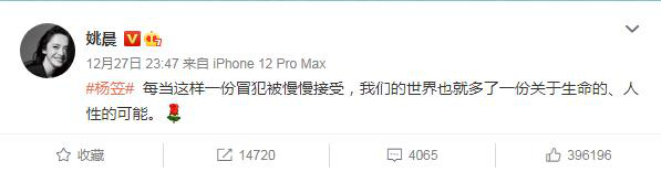 On the evening of December 27th, actor Yao Chen voiced his support for Yang Li on his personal social platform. Yao Chen wrote: "Whenever such an offense is slowly accepted, our world will have more possibilities about life and humanity."